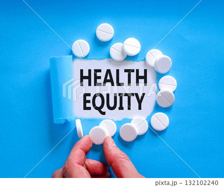 Health equity symbol. Concept words Health equity on beautiful white paper. White pills tablets. Doctor's hand. Beautiful blue background. Medical healthy lifestyle health equity concept.