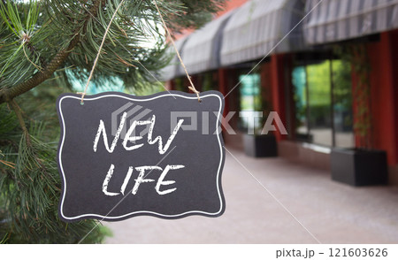 New life symbol. Concept words New life on black chalk background. Beautiful background with shop and tree. Business and New life concept. Copy space.
