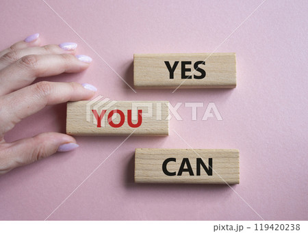 Yes You Can symbol. Concept word Yes You Can on wooden blocks. Beautiful pink background. Businessman hand. Business and Yes You Can concept. Copy space.