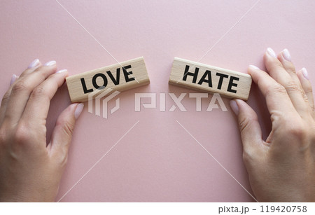 Love vs Hate symbol. Concept word Love vs Hate on wooden blocks. Businessman hand. Beautiful pink background. Business and Love vs Hate concept. Copy space