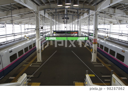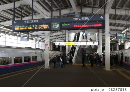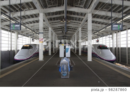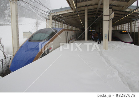冬のガーラ湯沢駅に停車中の上越新幹線E2系