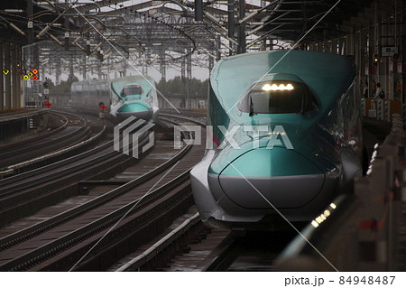 冬のガーラ湯沢駅に停車中の上越新幹線E7系・E2系