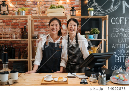 happy coffeehouse waitresses smiling confidently