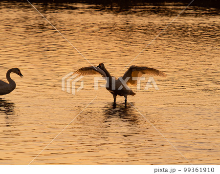 白鳥の越冬地 夕暮れの茨城県菅生沼の優雅で躍動的な白鳥のシルエット 羽ばたき