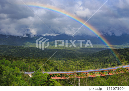 雄大な山並みに架かる虹と三国峠の橋