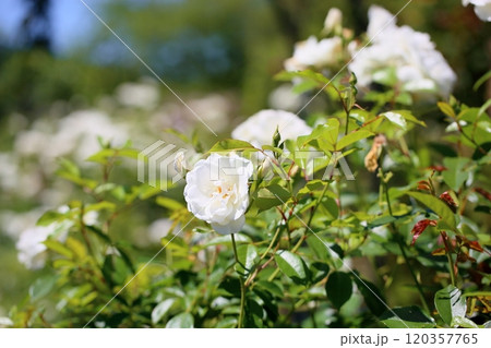 薔薇園に白色のバラの花が咲いています。このバラの名前はアイスバーグ(シュネーヴィッチェン)です。
