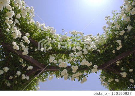 薔薇園に白色のバラの花が咲いています。このバラの名前はアイスバーグ(シュネーヴィッチェン)です。