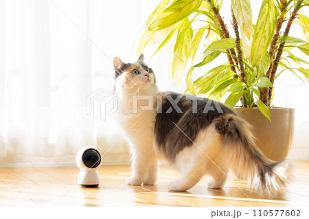 ペットカメラの近くを歩くお留守番中の猫