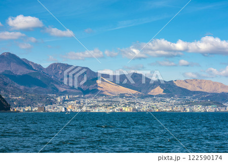 別府湾から見る別府市の街並みと鶴見岳を望む風景