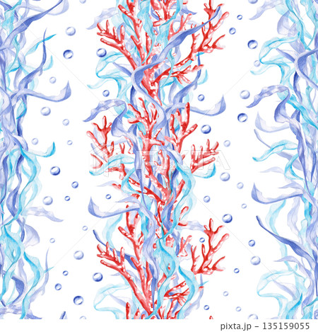 A seamless pattern with corals, seaweed, and bubbles. Hand-drawn watercolor illustration for pool decor, children's spaces, theme party designs, and fabric printing.