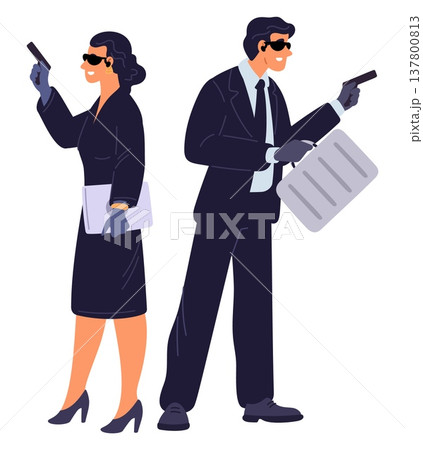 Man and woman. Two secret agents or spies with pistols in their hands. Spy and surveillance. Undercover job. People holding briefcases and guns. Male and female killers. Vector concept