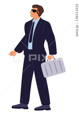 Athletic man. Secret agent or security guard wearing black sunglasses and suit. Bodyguard holding briefcase. Inspector with headset. Spy and surveillance. Undercover job. Vector concept