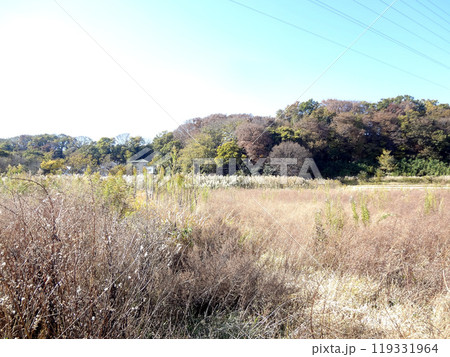 不用品の散乱する草刈り中の裏庭、左に隣家との境界の石垣と目隠し用の黒いフェンス