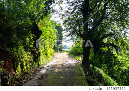 Rural road through tropical jungle on Praslin island in Seychelles leading to local houses