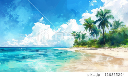 Sunny tropical Caribbean beach with palm trees and turquoise water, caribbean island vacation, hot summer day. 3D render.