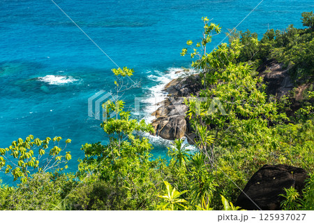 Scenic midday view from a tropical hilltop on Praslin Island, Seychelles