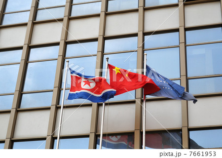 北朝鮮国旗と並ぶ中国国旗(中国・瀋陽)