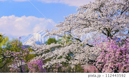 桜並木と雪の武尊山