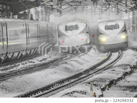 スプリンクラーの中を離合する新幹線 米原駅