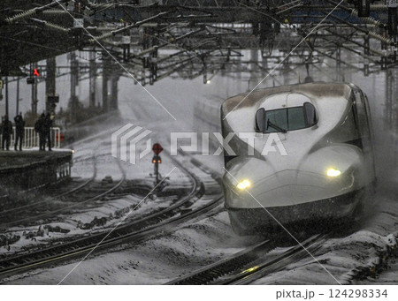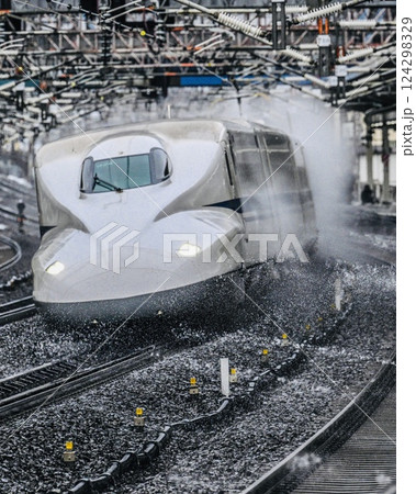 スプリンクラーの中を疾走する新幹線 米原駅の水飛沫