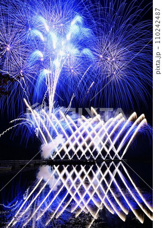鏡面の湖面に映る花火乱舞