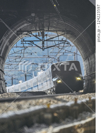 トンネルに突入する新幹線 ヘッドライトの存在感