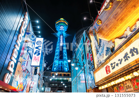 Tsutenkaku tower light up at night in Shinsekai, Osaka, Japan