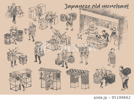 江戸時代の商人や商売道具、食べ物の白黒線画イラスト 日本人 侍 武士 町民 農民