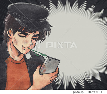 昭和の男前な学ラン番長がスマホを持つイラスト