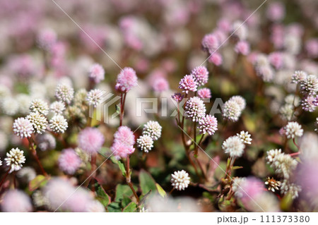 秋の庭に咲くヒメツルソバのピンク色や白の小さい丸い花