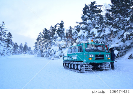 冬の雪山で活躍する除雪車と樹氷に覆われた木々 (長野県、山ノ内町、横手山)