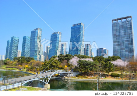 Spring of Songdo Central Park and skyscraper in Incheon, Korea