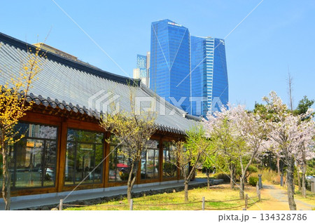 韓国仁川 松島の公セントラルパーク園での眺め 青空の下高層ビルと韓屋の前で桜の咲く風景