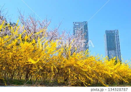 韓国仁川 松島セントラルパーク公園での眺め 青空の下高層ビルと桜、ケナリの咲く風景