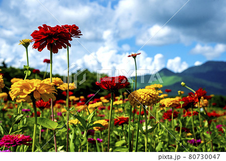 山中湖村花の都公園に咲き乱れる百日草と背景の高座山そして積乱雲