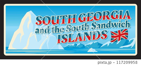 South Georgia and the South Sandwich Islands, British overseas territories. Vector travel plate, vintage tin sign, retro postcard design. Plaque with SGSSI landscape with icebergs and flag