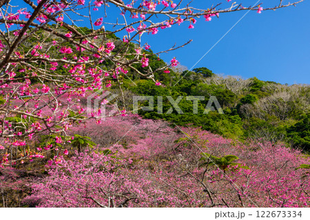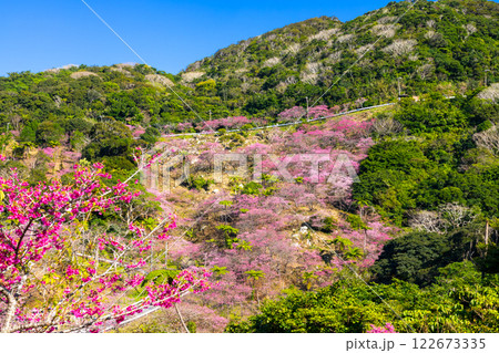 沖縄県国頭郡本部町 もとぶ八重岳桜まつりが行われる八重岳山頂付近の琉球寒緋桜のさくらの山