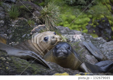 2頭で仲良く寝そべるゾウアザラシの赤ちゃん サウスジョージア島