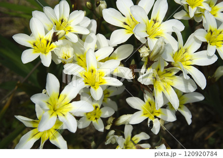 白い水仙綾目の花、スイセンアヤメの白い花、スパラキシスの白い花