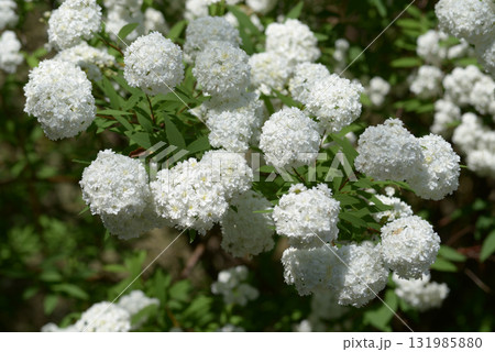 手鞠のようなかわいいコデマリの白い花集団(自然光+マクロ接写写真)