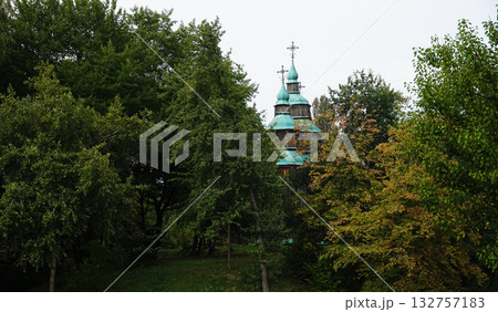 Kyiv, Ukraine, September 1, 2025: The wooden Church of St. Nicholas in the Pirogovo Museum in Kyiv