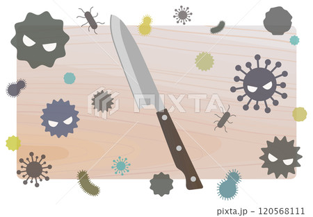 まな板にバイ菌が繁殖しているベクターイラスト 食中毒 細菌 包丁 毒 病原菌 ばい菌 バイキン 黴菌