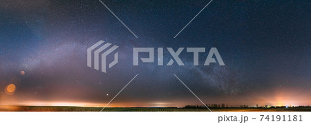 Night Starry Sky With Glowing Stars Above Countryside Landscape. Milky Way Galaxy And Rural Field Meadow In Early Spring. Panorama, Panoramic View