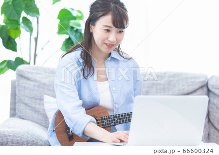 オンラインで楽器(ウクレレ)のレッスンを受ける若い女性