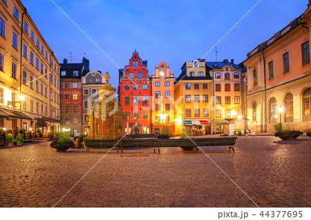 スウェーデン 夜のストックホルムの旧市街、ガムラスタンの街並み