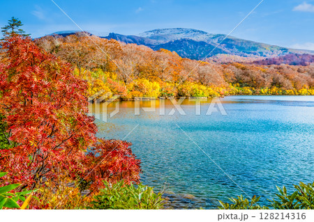 秋田 紅葉に染まる須川湖と冠雪の栗駒山
