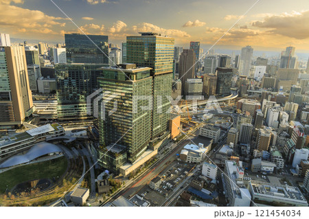 大阪梅田の高層ビル街に夕日が落ちて