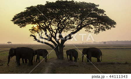 Silhouette tree animal elephant and mahout man Sunrise backgrou