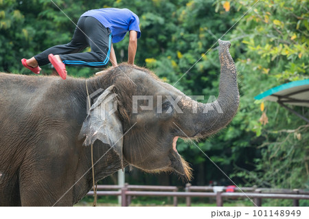 mahout jump on elephant while mammoth raise its trunk at zoo