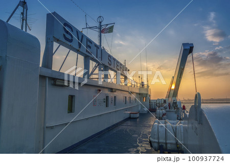 夜明けのアドリア海を航行するフェリー / Bari, Italy